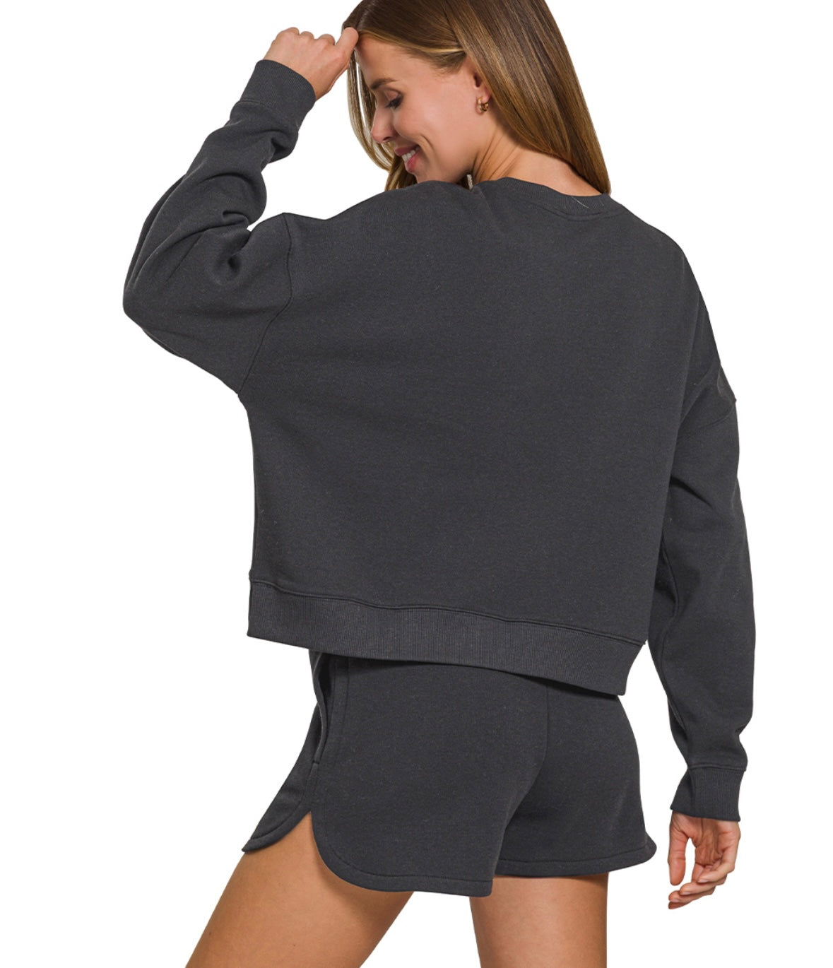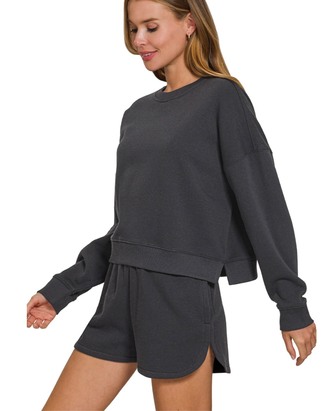 - Details: Dolphin-cut shorts with side pockets + relaxed long sleeve pullover